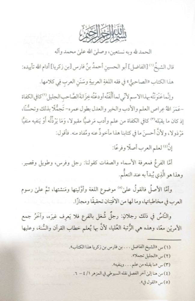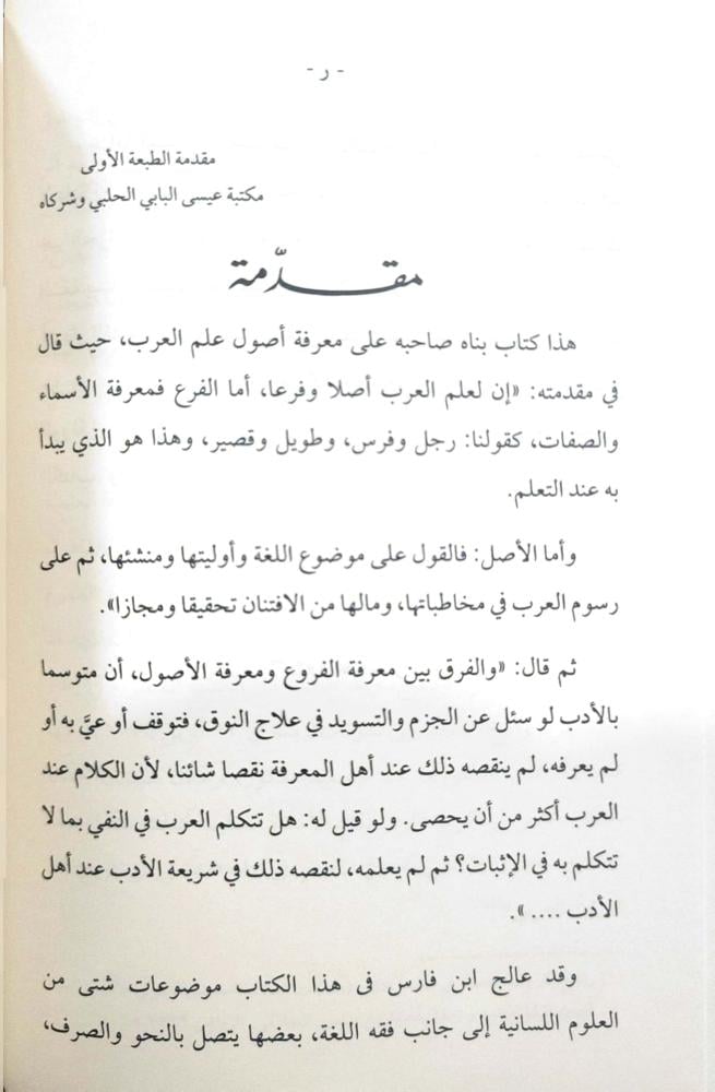 أول كتاب جمع ما تفرق من فنون فقه اللغة. وهو في موضوعه أشبه بكتاب الخصائص لابن جني. إلا أن عبارته فيه موجهة لتكون في متناول الجميع، بخلاف عبارة ابن جني الذي يضرب به المثل في التفاصح. ومنزلة ابن فارس عند الكوفيين منزلة ابن جني عند البصريين، وهما طبقة واحدة. ألف ابن فارس كتابه هذا في ناحية تدعى المحمدية في مدينة الري، سنة 382هـ وأهداه للصاحب ابن عباد، ووسمه بلقبه، ورفعه إلى خزانته. وكان أولاً من ندماء ابن العميد. وقال في مقدمته: (والذي جمعناه في مؤلفنا هذا مفرق في أصناف مؤلفات العلماء المتقدمين، وإنما لنا فيه اختصار مبسوط، أو بسط مختصر، أو شرح مشكل، أو جمع متفرق). وقد ذكر كتابه هذا في مقدمة كتابه (مقاييس اللغة.ط) وفي كتاب (فقه اللغة) للثعالبي ، و (المزهر) للسيوطي نقولات جمة منه. بل إن السيوطي استعار مقدمة ابن فارس بحذافيرها فجعلها مقدمة لكتابه المزهر ثم قال: وبمثل قوله أقول. طبع الكتاب لأول مرة في القاهرة سنة 1910م باعتماد نسخة الشنقيطي التي انتسخها من نسخة جامع بايزيد، وقد كتبت بالمحمدية في الري سنة 382هـ وعليها توقيع ابن فارس في مواضع كثيرة، كما أفاد الشويمي في نشرته للكتاب ضمن سلسلة المكتبة اللغوية العربية، بيروت 1963م. معتمداً نسخة بايزيد ونسخة أياصوفيا. وفي مقدمة الشويمي تعريف بابن فارس ومؤلفاته، وأماكن وجودها. وفيها قوله: (يعتبر ابن فارس مثال الأمانة العلمية في كتبه، حيث نرى معظم أقواله منسوبة إلى أصحابها، مرفوعة إلى قائليها بأسانيد كصنيع أهل الحديث). ويمكن تقسيم الكتاب إلى أربعة أقسام: 1- موضوعات عامة تتصل باللغة وخصائصها وعسر ترجمتها، وفيه يذهب إلى أن علمي العروض والنحو، كانا معروفين في الجاهلية. وينتهي هذا القسم صفحة (80) من المطبوع 2- بحوث نحوية ولغوية، تناول فيها أنواع الأسماء والأفعال والحروف، وختمها بمعجمين للحروف، الأول: لآثارها النحوية، والثاني: لحروف المعاني، على غرار كتاب المغني لابن هشام، وينتهي صفحة179. 3- بحوث متفرقة في النحو والصرف والمعاني والبيان، اشتملت على أبواب غير مشهورة، كالبسط والقبض والمحاذاة والتعويض، والاقتصاص في نظم القرآن. 4- تعريف موجز بالشعر، وفيه كلام عن الفرق بين العروض والإيقاع، وروايةٌ عن أبيه: فارس بن زكريا، وأحال في آخره إلى ما بسطه في كتاب له في نعت الشعر سماه: (خضارة) في أغاليط الشعراء. وخُضارة: اسم معرفة للبحر. نقلا عن الوراق .