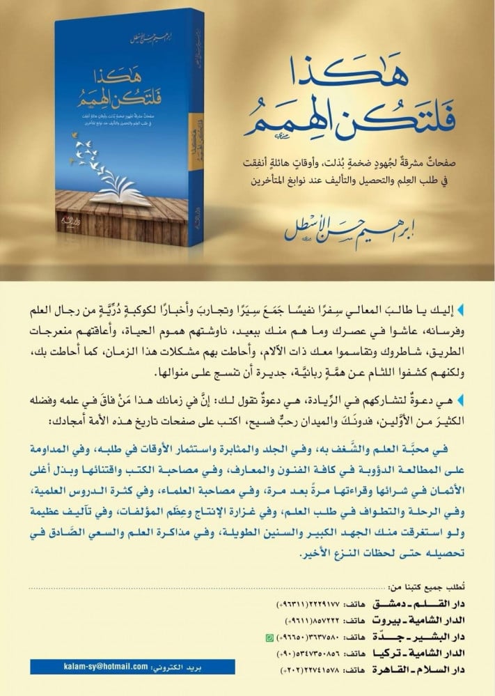 عنوان الكتاب : هكذا فلتكن الهمم : صفحات مشرقة لجهود ضخمة بُذلت ، وأوقات هائلة أُنفقت في طلب العلم والتحصيل والتأليف عند نوابغ المتأخرين