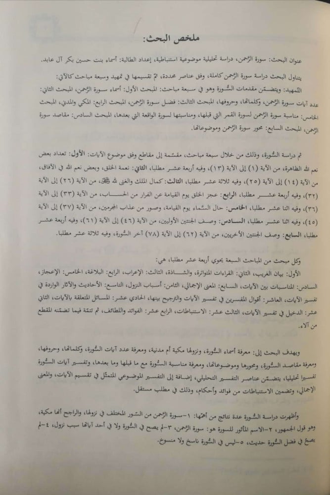 عنوان الكتاب : سورة الرحمن دراسة تحليلية موضوعية استنباطية (رسالة ماجستير)